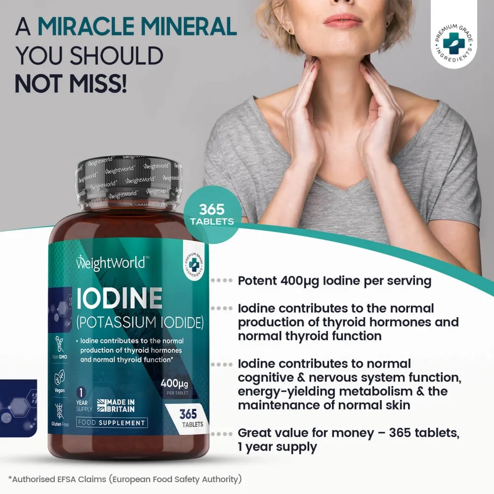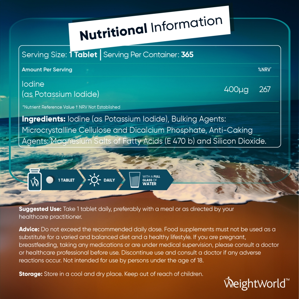 Iodine occurs naturally in certain foods, such as seaweed, fish, dairy and eggs. The body needs iodine to maintain normal thyroid function, and iodine deficiency can lead to fatigue, poor skin quality and poor memory. At WeightWorld, we have specially formulated our iodine tablets to offer 400 µg of easily absorbable iodine (potassium iodide) per serving. With 365 iodine supplements in a bottle, you can forget about restocking for an entire year!