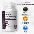 Black Elderberry, Liposomal Vitamin C Complex, Zinc Citrate, Vegetable Cellulose, Rice Flour, Magnesium Vegetable Stearate, Microcrystalline Cellulose.