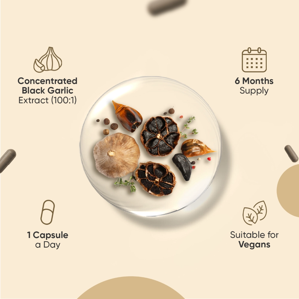 - High-strength 15,000mg of black garlic powder/capsule