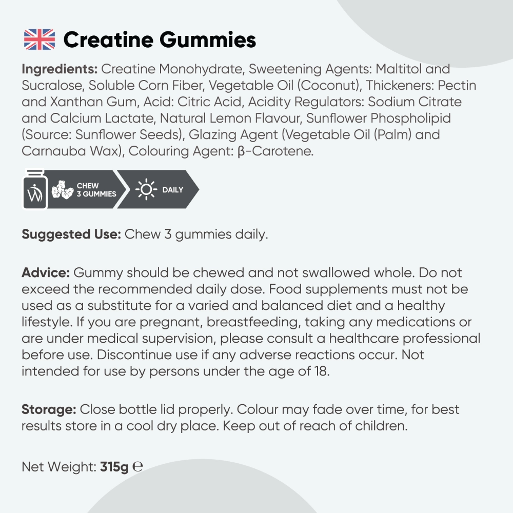 Simply chew and enjoy 3 Creatine Gummies daily. You can take one gummy in the morning, one in the afternoon and one in the night, or take them all at once. It is recommended that you take the gummies at approximately the same time every day, as consistency is the key.