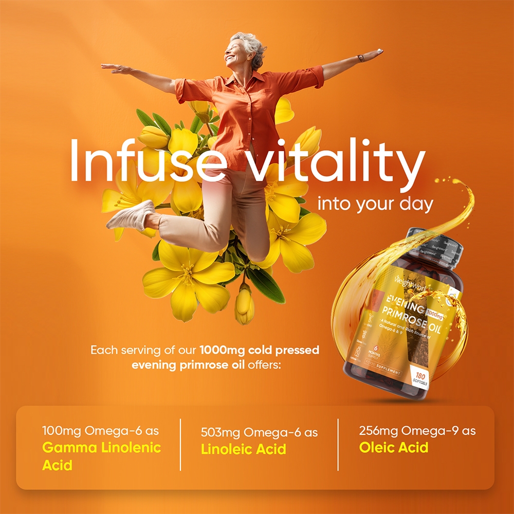 Do not exceed the recommended daily dose. Food supplements must not be used as a substitute for a varied and balanced diet and a healthy lifestyle. If you are pregnant, breastfeeding, taking any medications or are under medical supervision, please consult a doctor or healthcare professional before use. Discontinue use and consult a doctor if any adverse reactions occur. These Evening Primrose Oil Capsules are not intended for use by persons under the age of 18.