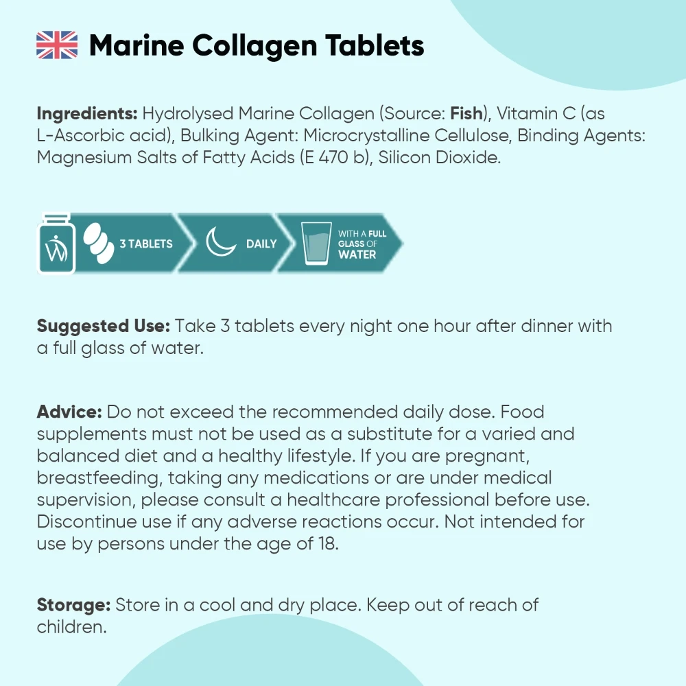 Take three tablets every night one hour after dinner with a full glass of water. For best results, we suggest taking the marine collagen supplement around the same time each day.