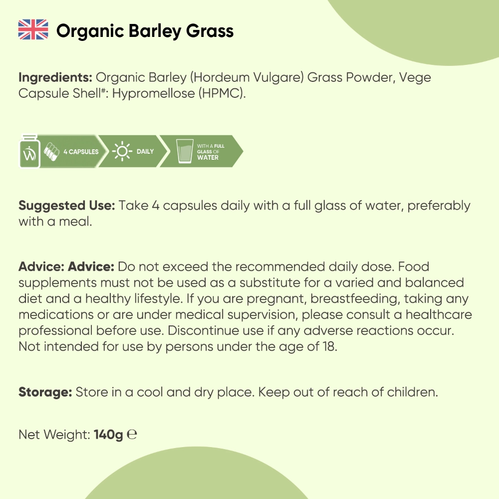 Simply 4 capsules daily with a full glass of water, preferably with a meal. You can take these Barley Grass Capsules in the day or at night with your main meals. However, we recommend that you take them at approximately the same time every day, as consistency is the key.