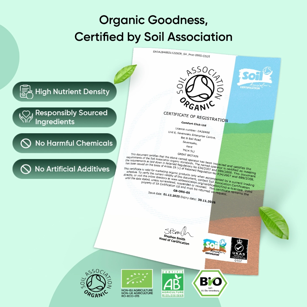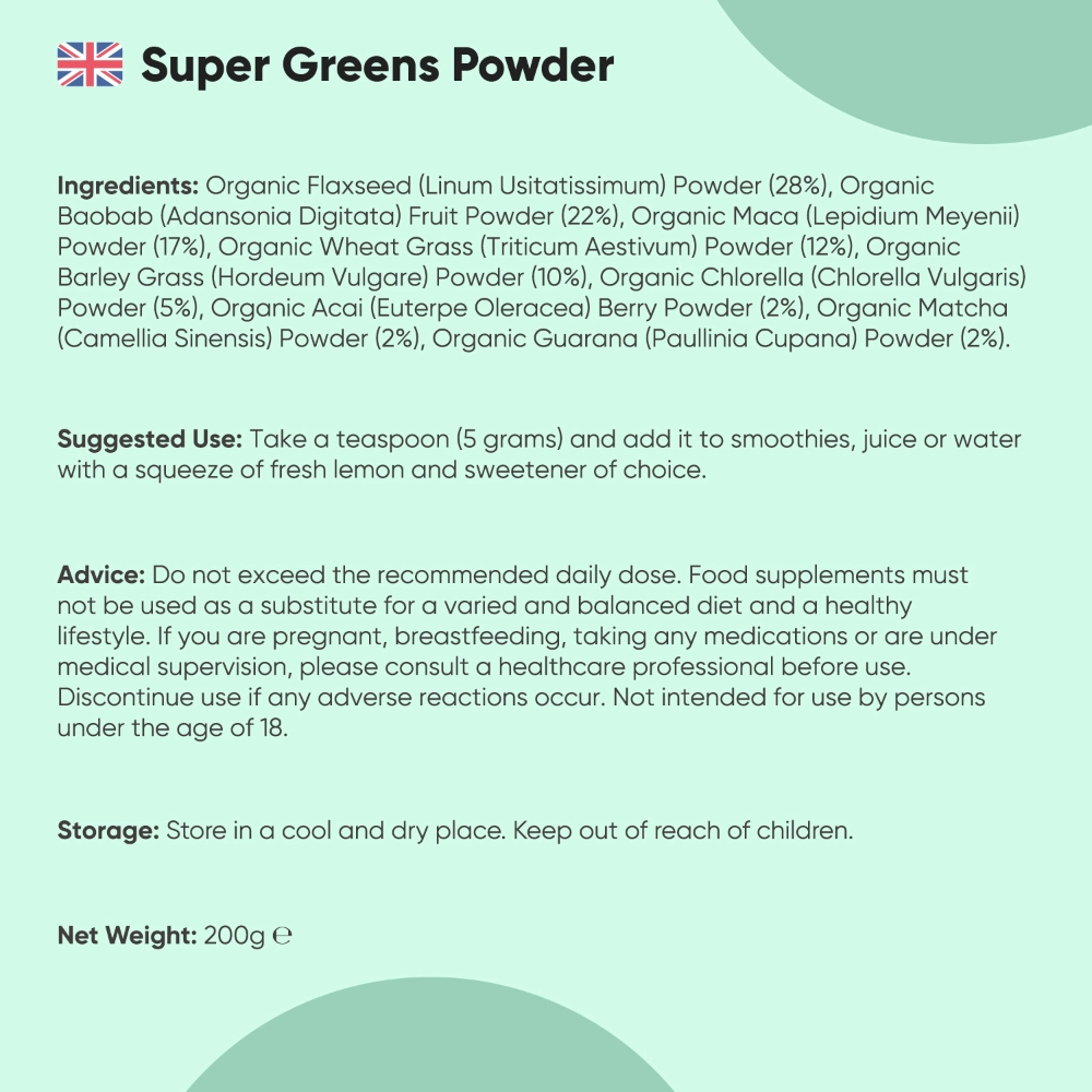 Take a teaspoon (5 grams) of the Organic Super Greens Powder and add it to smoothies, juice, or water with a squeeze of fresh lemon and sweetener of your choice. You can take this supplement at any time of the day as per preference. We recommend taking it at approximately the same time every day, as consistency is the key.