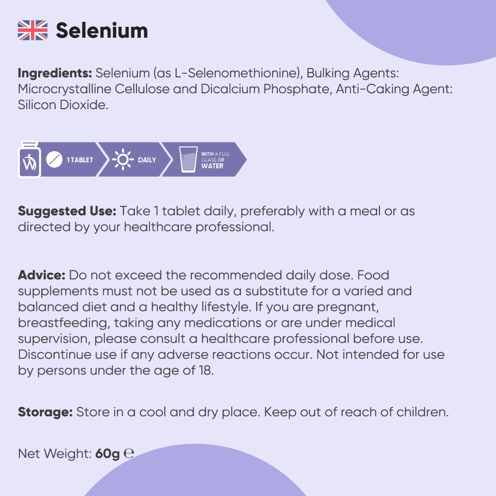 Take 1 Selenium Tablet daily with a full glass of water, preferably with a meal. For optimal results, we recommend taking the tablets at approximately the same time every day on an ongoing basis and invest in long-term use.