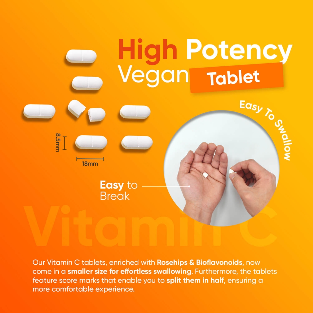 Vitamin C is known to contribute to the normal function of the immune system, and we have developed Vitamin C Tablets to offer you 1000mg of this essential vitamin in a convenient form. No need to settle for low-dosage vitamin C supplements anymore! To complement its benefits, we have enriched our vitamin C supplement with Bioflavonoids and Rosehip, outshining normal vitamin C capsules on the market. Just take 1 Vitamin C 1000mg Tablet a day to take on your day with confidence!