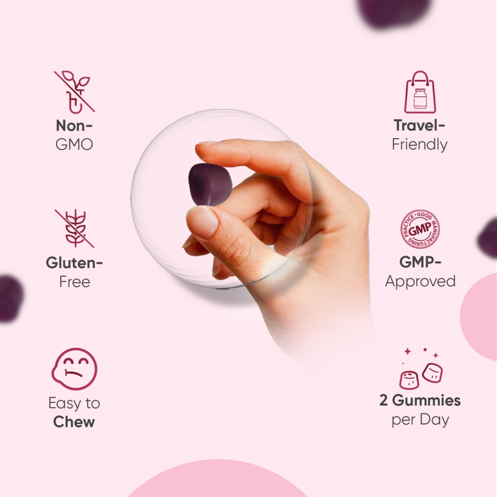 • Just 2 fun-to-chew gummies a day, offering a complete 1.5-month supply per bottle
